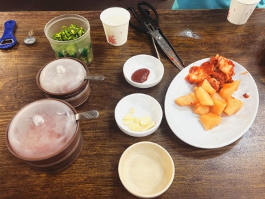 - 각 테이블마다 소금, 새우젓, 고추 슬라이스, 다대기, 들깨가루, 고추기름이 준비되어 있습니다.
