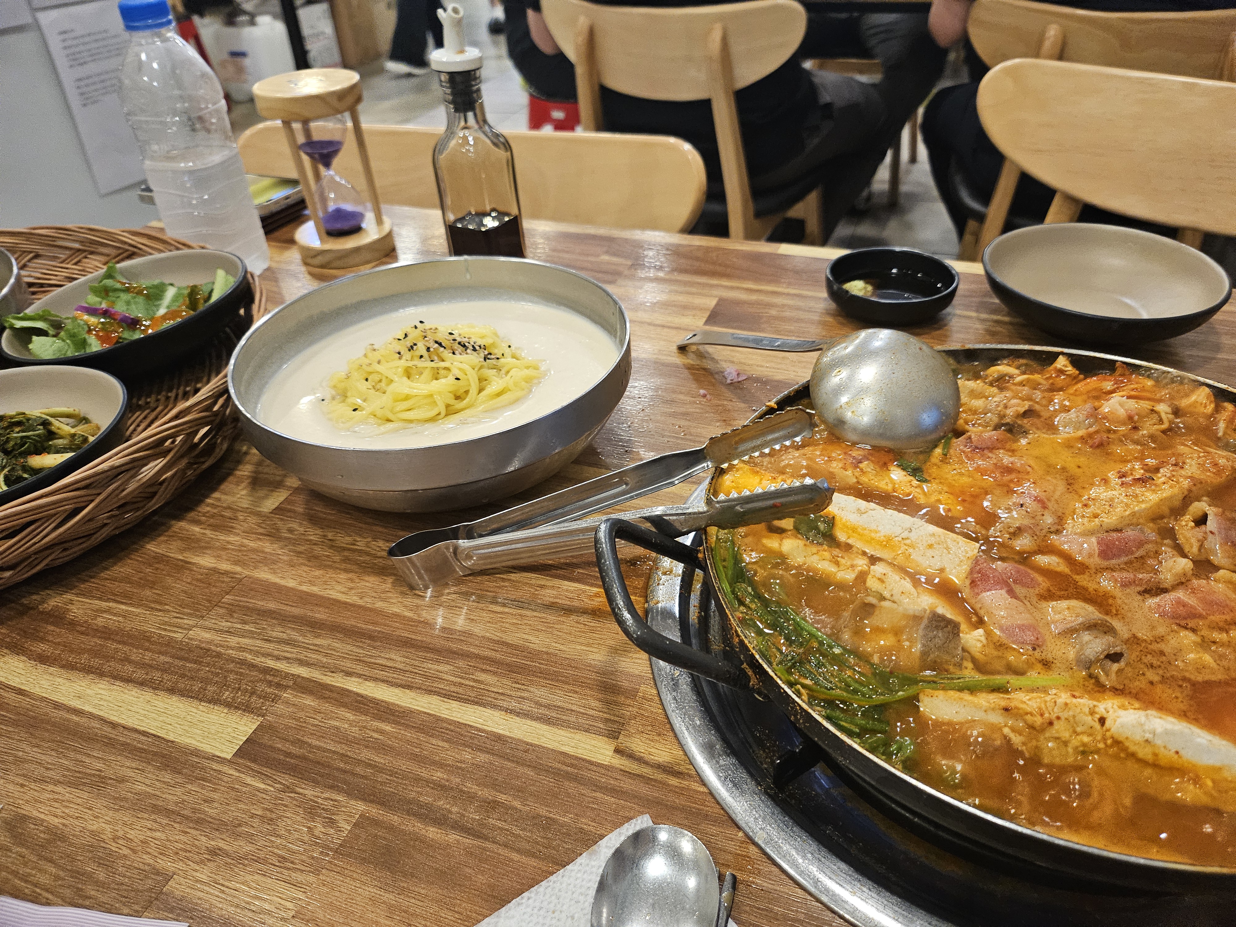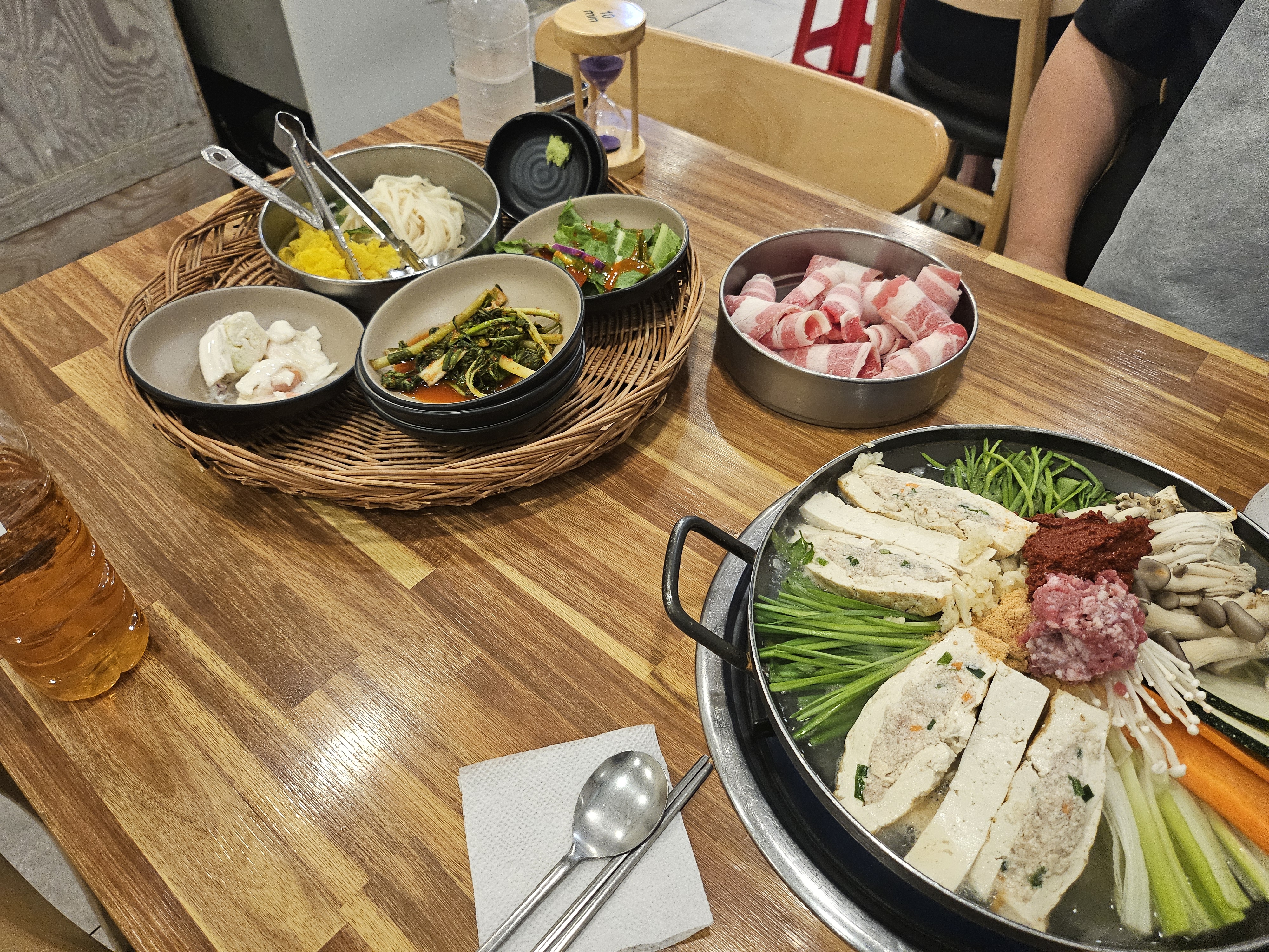 👉 두부전골은 불을 켠 시점으로부터, 테이블 위 에 놓인 10분짜리 모래시계가 다 내려가면 완성!