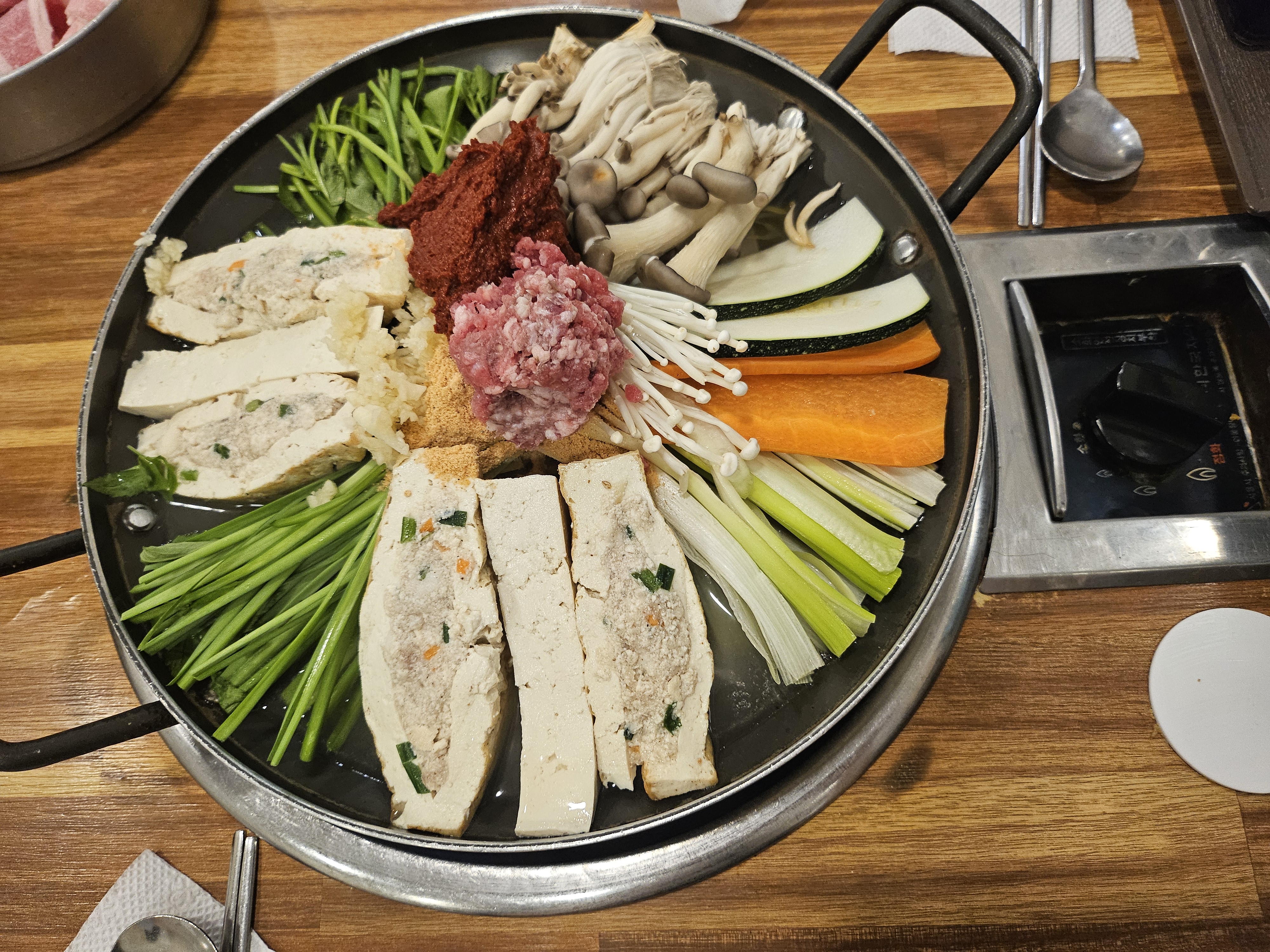 ❗️ 두부전골 : 샌드위치 두부와 돼지고기, 버섯, 야채, 샤브고기의 어우러짐. 깊고 담백한 국물 맛.