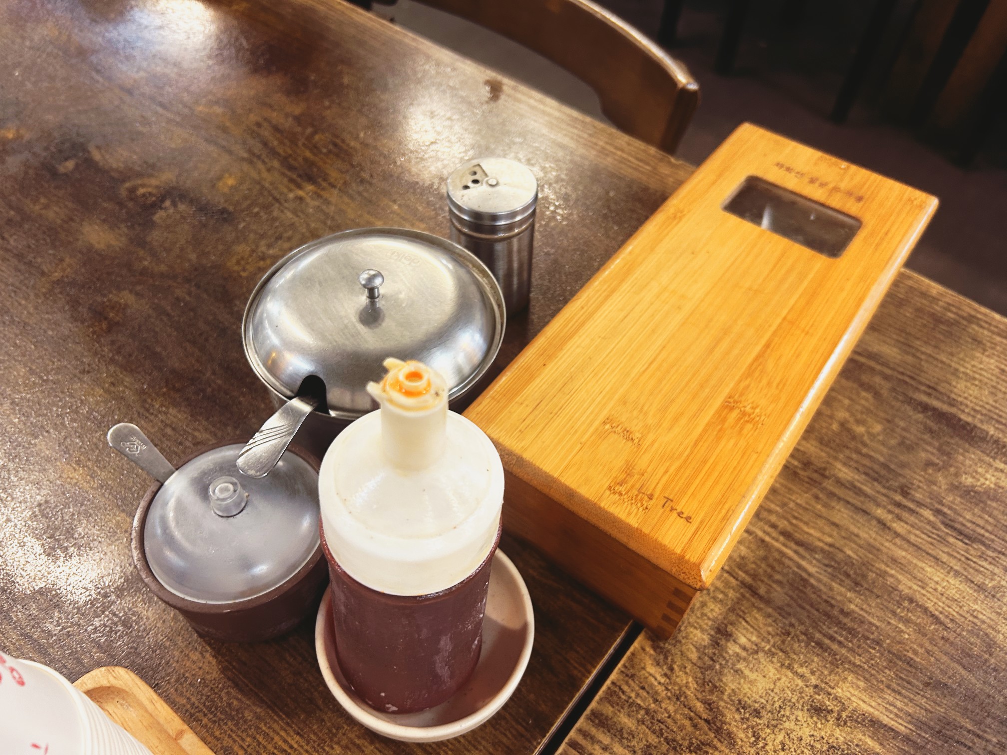 각 테이블마다 공용 소금, 새우젓, 고추 슬라이스, 다대기, 들깨가루, 고추기름,후추가 세팅되어 있습니다.